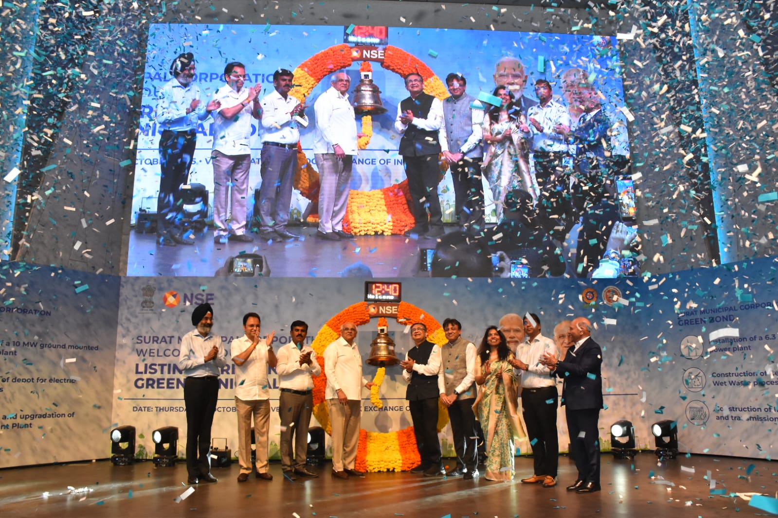 मुख्यमंत्री भूपेंद्र पटेल ने मुंबई नेशनल स्टॉक एक्सचेंज में सूरत नगर निगम के म्यूनिसिपल ग्रीन बॉन्ड की बेल बजाकर मेयर दक्षेश मावाणी की उपस्थिति में लिस्टिंग की।