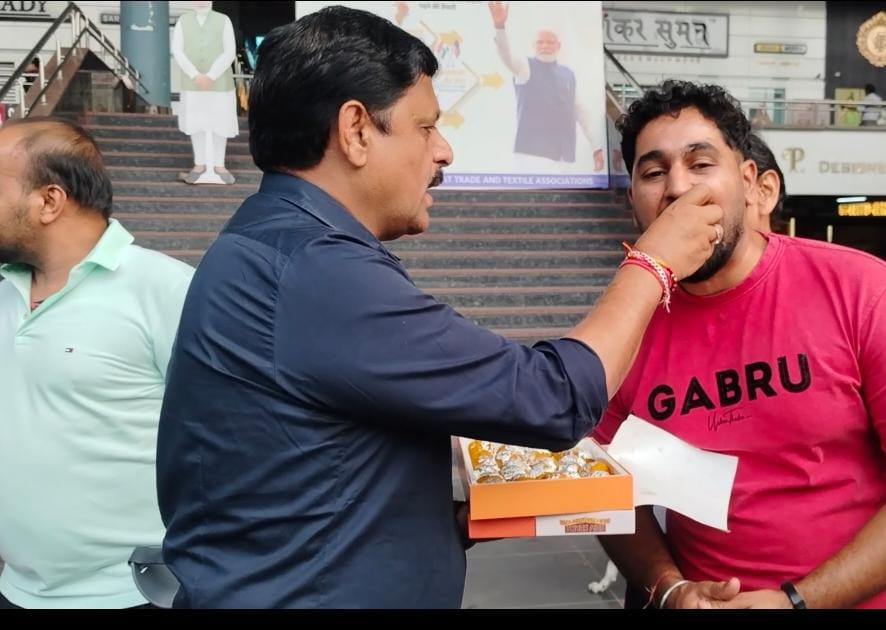 सूरत के कपड़ा व्यापारिक संगठन फेडरेशन ऑफ सूरत ट्रेड एन्ड टेक्सटाइल एसोसिएशन ने मिलेनियम मार्केट प्रांगण में यूएस टैरिफ में कटौती और यूरोप एफटीए की मिठाई बांटकर खुशी मनई।