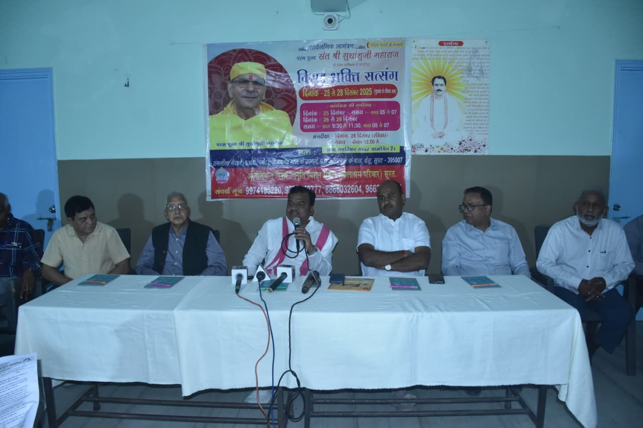 आयोजकों ने बताया कि इस विराट भक्ति सत्संग में सूरत सहित वडोदरा, अहमदाबाद, मुंबई, पुणे, नासिक, धूलिया, दिल्ली, जयपुर समेत देश के विभिन्न शहरों से बड़ी संख्या में श्रद्धालु और महाराजजी के शिष्य भाग लेंगे। आयोजन को लेकर श्रद्धालुओं में विशेष उत्साह देखा जा रहा है। पत्रकार परिषद में डॉ. रजनीकांत दवे, मंडल संरक्षक सुरेश मालानी, दिलीप ब्रह्मभट्ट, पूरणमल सिंगल, अश्विनी अग्रवाल, राजेन्द्र ठाकुर, बंसी जोशी, मंडल प्रबंधक राजेश ठाकर सहित समिति से जुड़े अनेक गणमान्य व्यक्ति उपस्थित रहे।